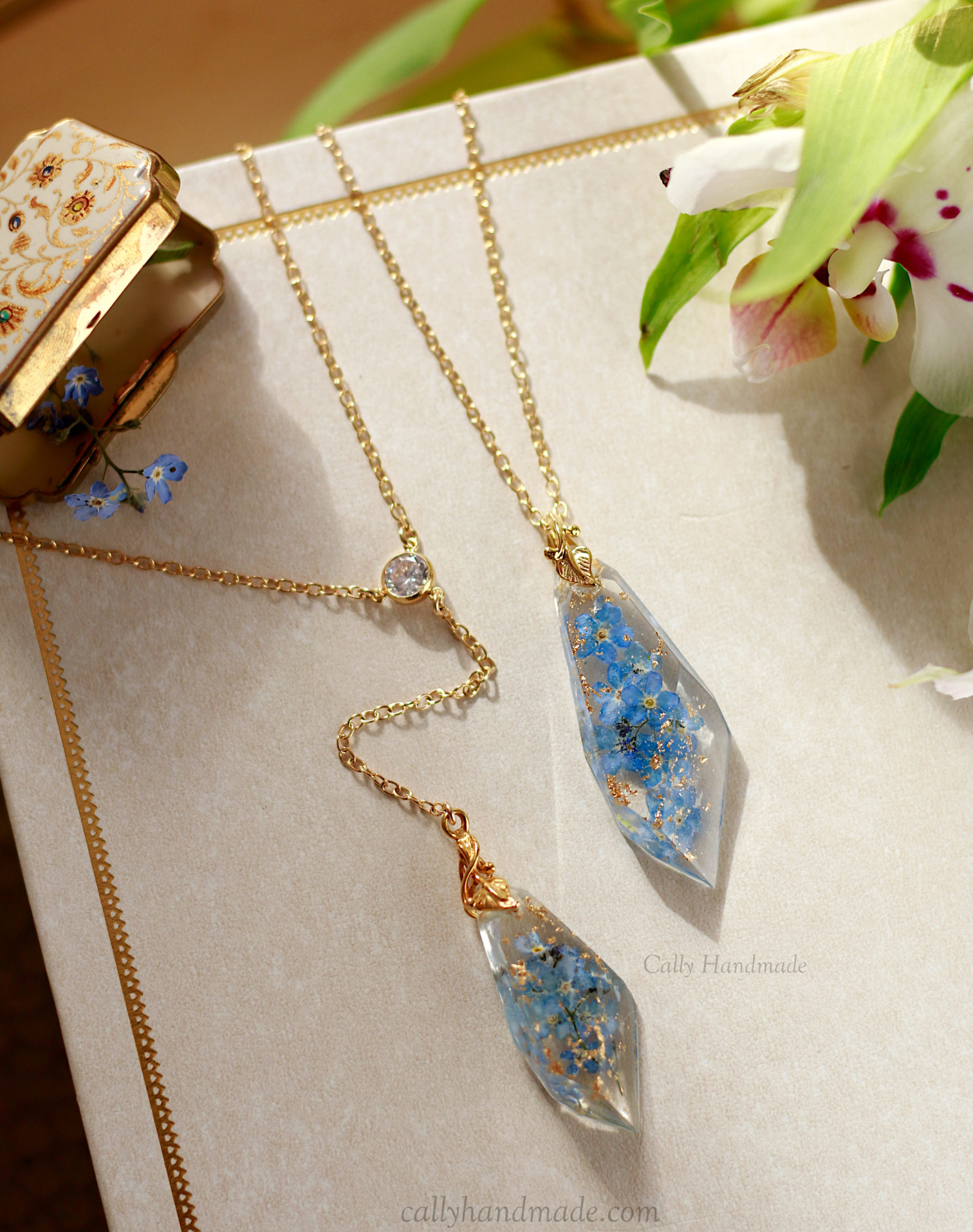 Description : Ce superbe collier de dos est composé de fleurs de myosotis et de paillettes d’or enchâssées dans un cocon en résine biosourcée . Il est monté sur une chaîne en gold filled (or rempli).  La bélière est en argent massif et plaqué or.