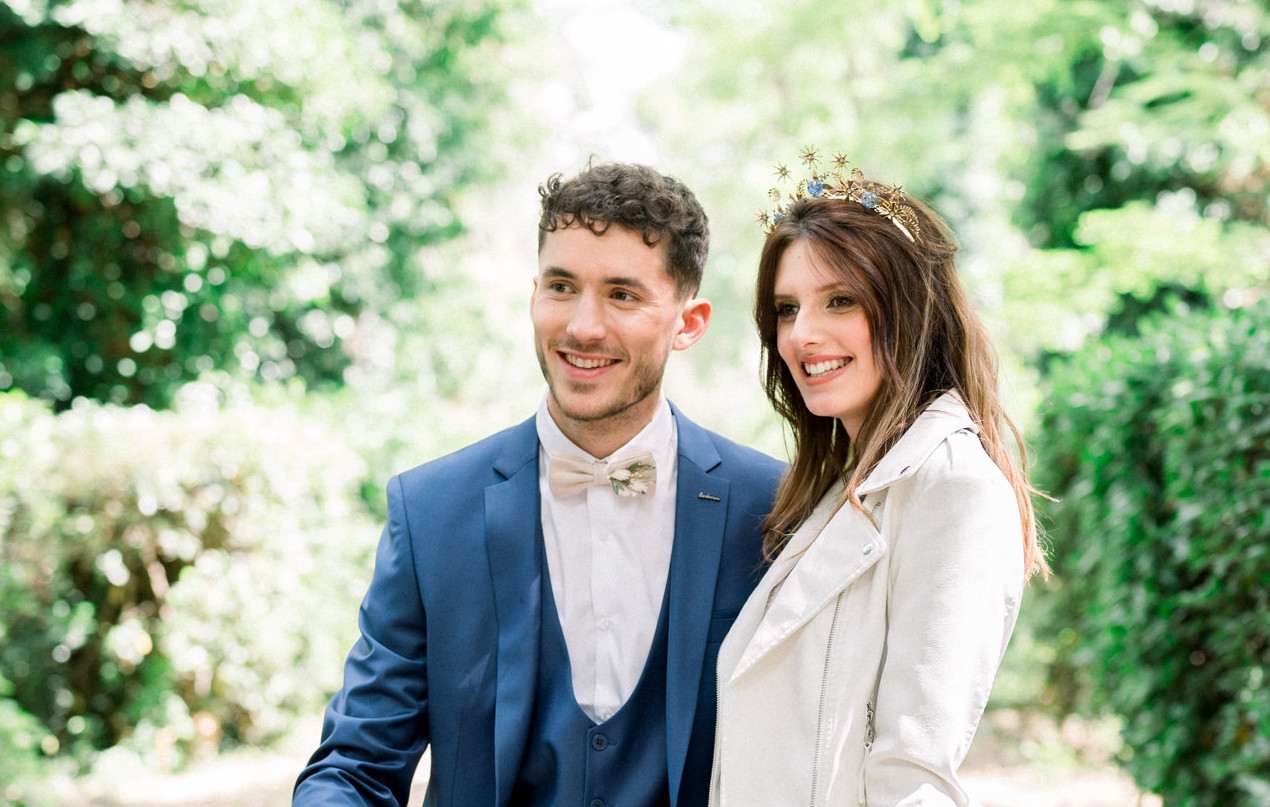 Cette magnifique tiare est composée d’estampes en laiton de qualité, stylisées en forme d’étoiles, de strass Swarovski couleur opale et de sphères en résines biosourcée, entièrement réalisées à la main, incluant des fleurs de myosotis et des paillettes d’or 24 carats. La tiare est assemblée sur des fils en or rempli (gold filled).
