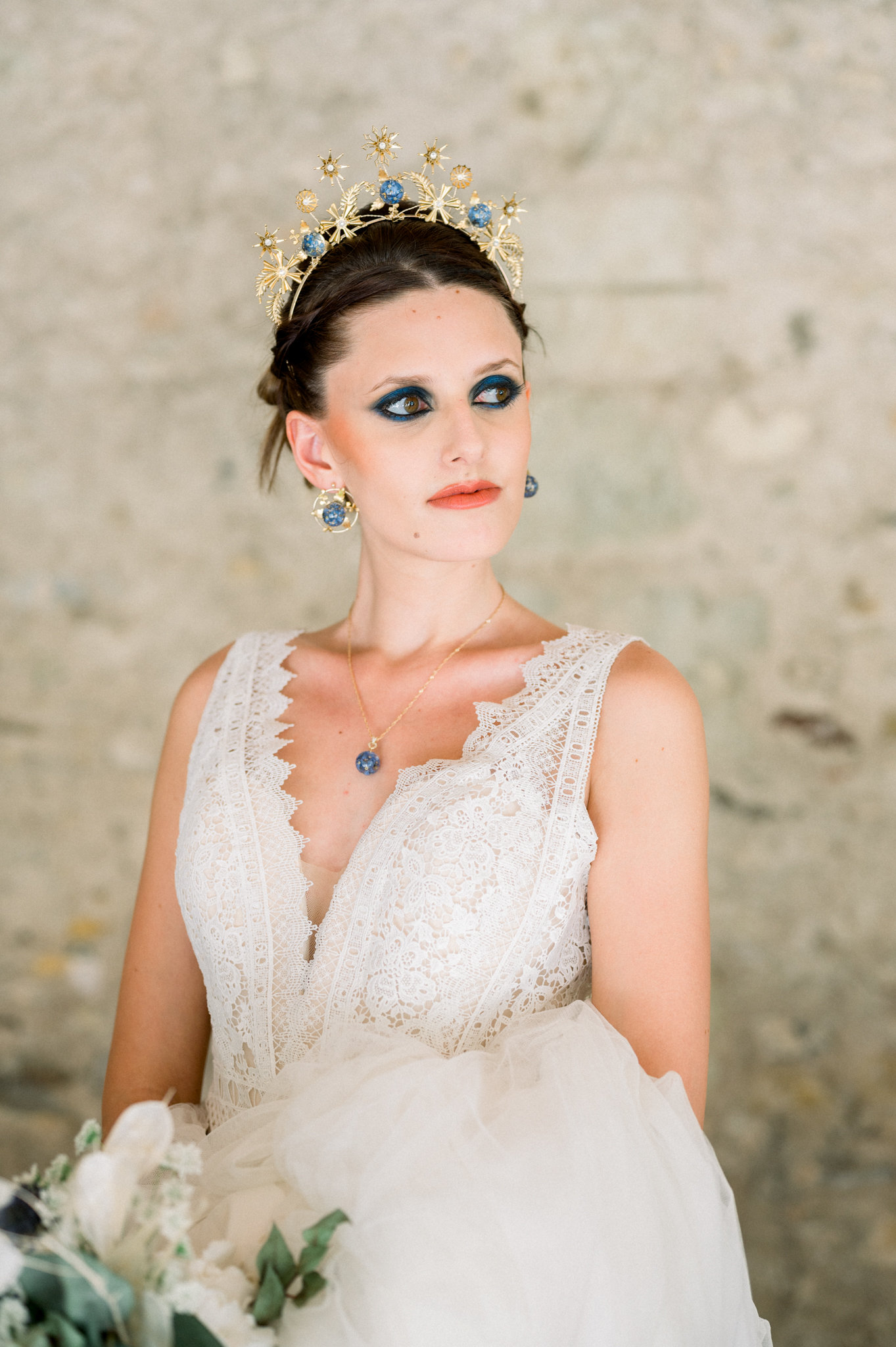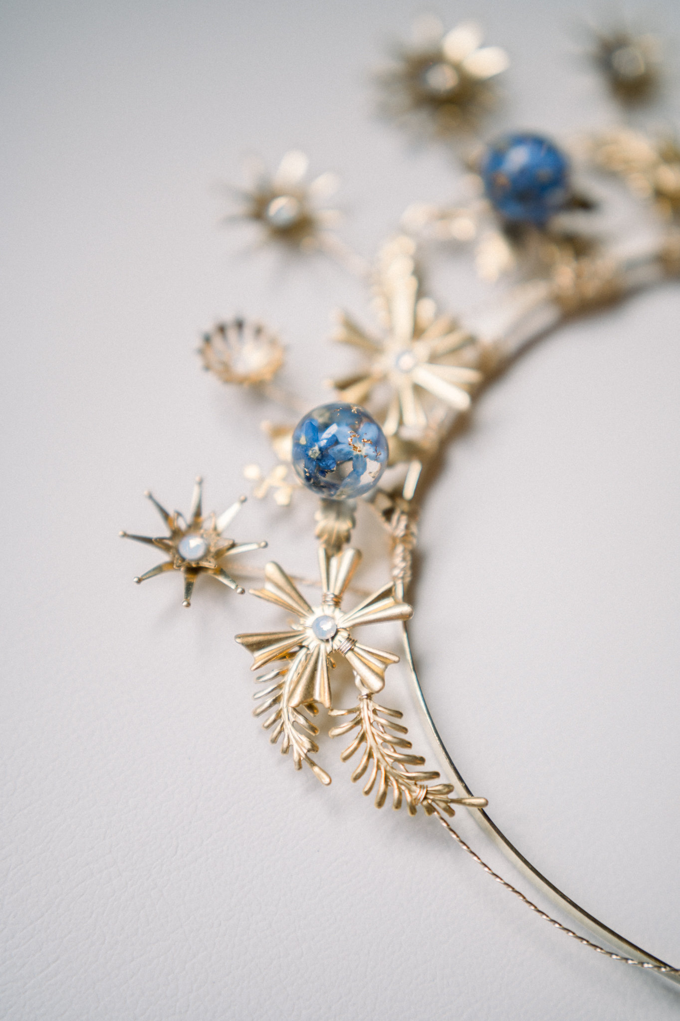 - Cette magnifique tiare est composée d’estampes en laiton de haute qualité, stylisées en forme d’étoiles, de strass Swarovski couleur opale et de sphères en résines biosourcée, entièrement réalisées à la main, incluant des fleurs de myosotis et des paillettes d’or 24 carats. La tiare est assemblée sur des fils en or rempli (gold filled).